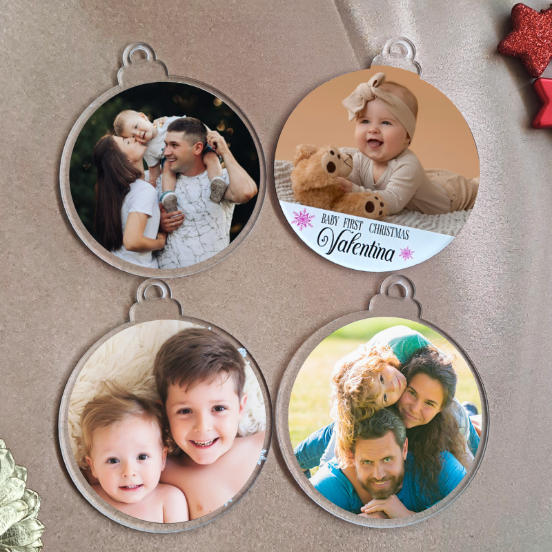 Ornamentos de navidad. 4 Adornos en acrílico con fotografía y nombre. Medida 9 cm.