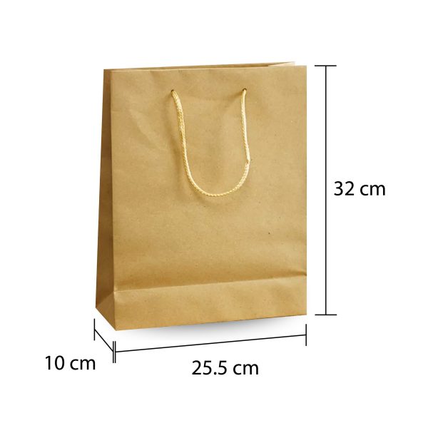 Bolsa de papel Kraft en material biodegradable con cordón, medida de la bolsa 25.5x32x10 cm.