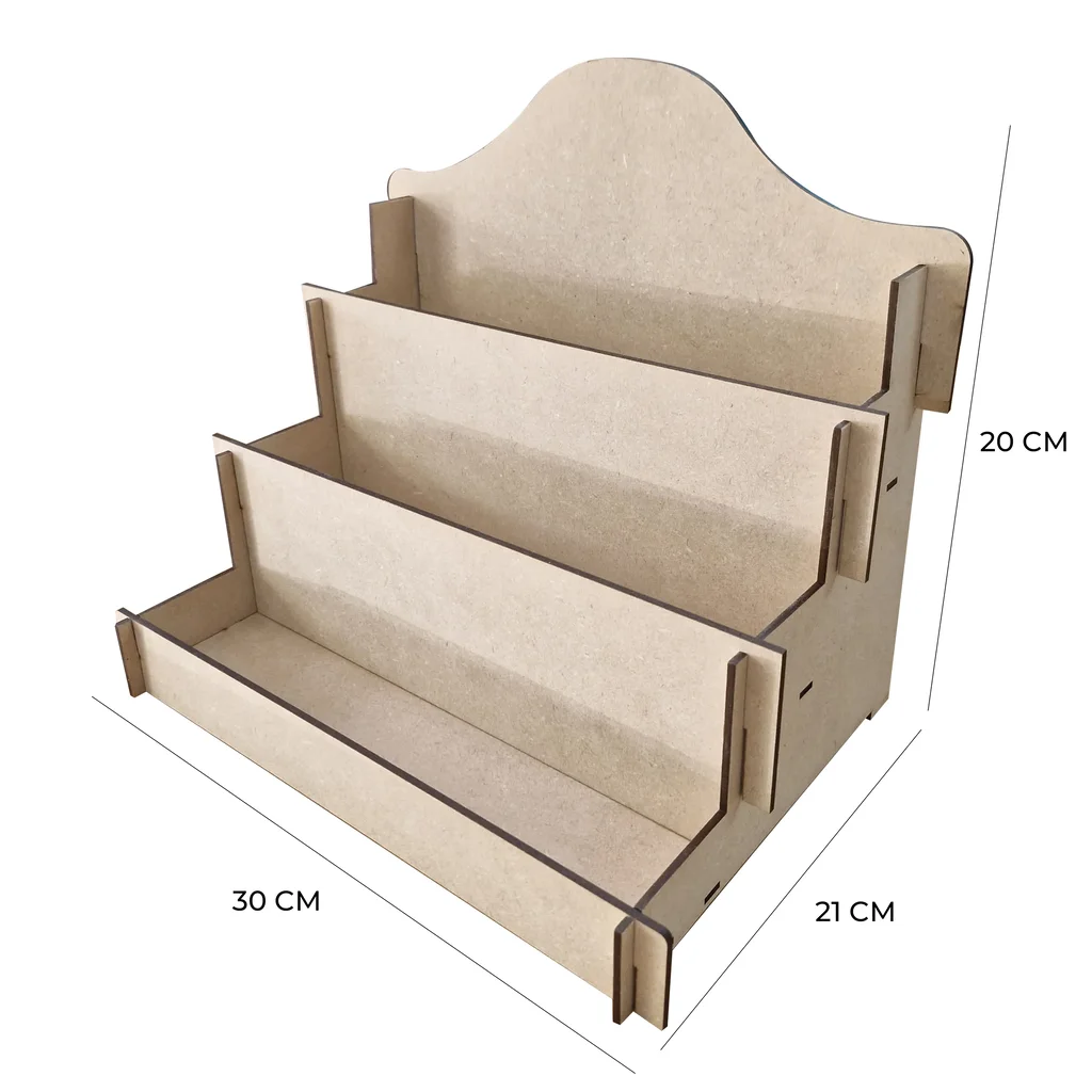 Este display de 3 niveles fabricado en MDF es ideal para tiendas, ferias o decoración.