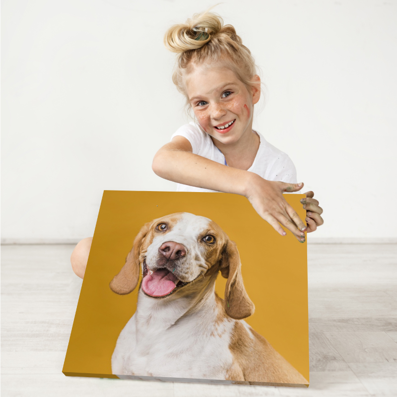- Cuadro fotográfico impreso en lona mate o brillante y montado en marco de madera de 16×16 pulgadas.